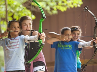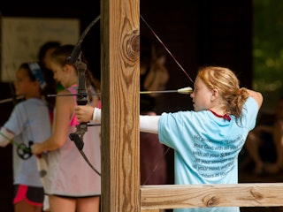 Even our youngest campers learn how to shoot a bulls-eye with our compound bows. We also play fun games like tic-tac-toe, shoot at balloons, and compete in tournaments for club points.