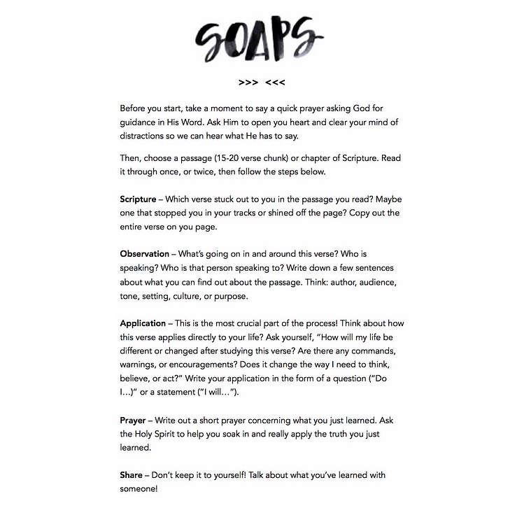 What’s a SOAP? It’s a simple Bible study method we’ve adopted at camp that we really, really enjoy. Check out the breakdown we’ve included!
