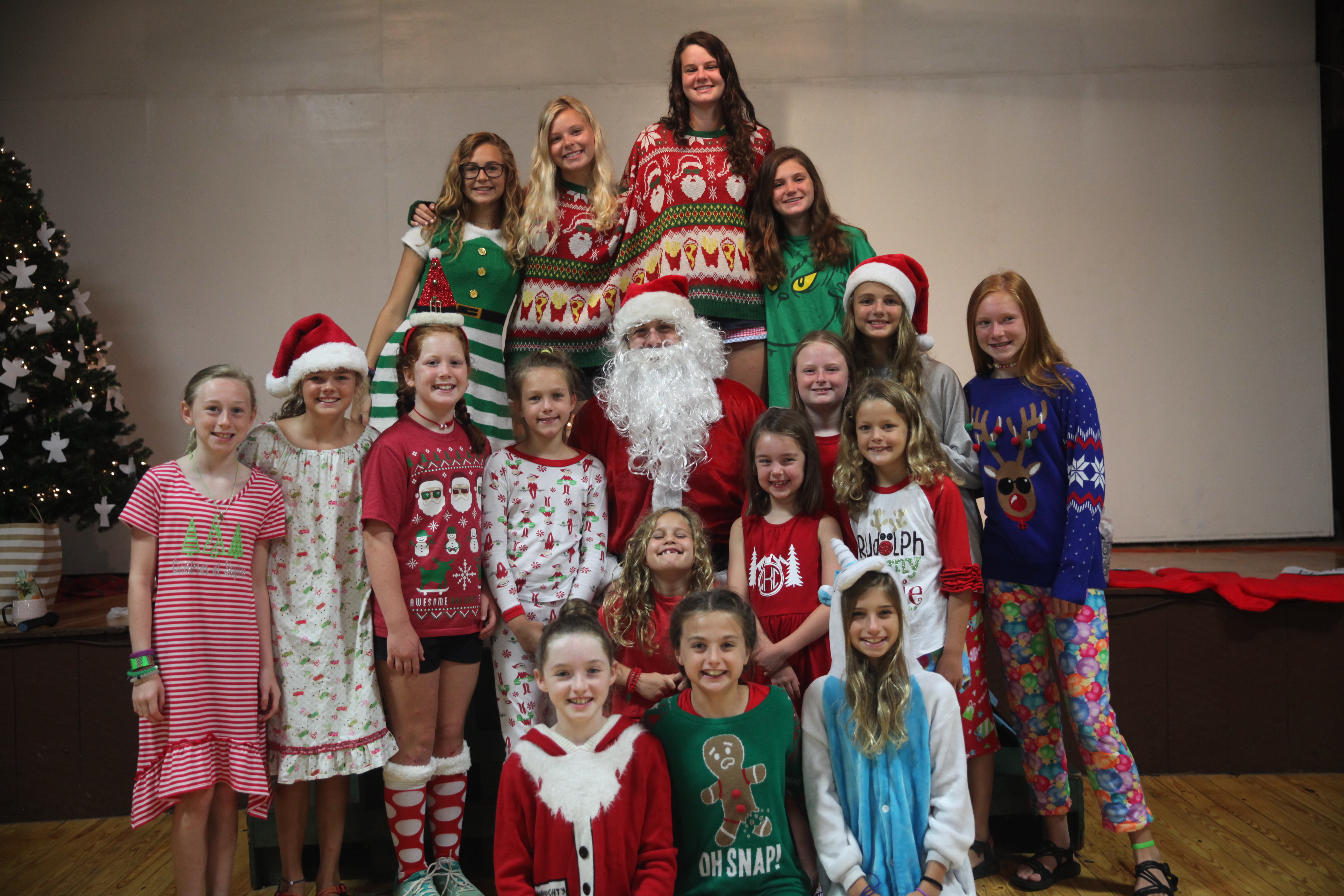 From there it was straight to the gym to open presents and see what Santa brought everyone and for all the counselors to finally find out who their secret Santa was. Of course Santa made his arrival in “camp” style riding up on his 4X4 side by side with the bed of it loaded with presents for all the campers. All the campers were excited when they sow what they got and then many of ‘em made their way up to Santa on the stage for their very own photo op. It was great, no lines to wait in like at the mall!!! After everyone open their presents Sarah Kate read the very first Christmas story to everyone so they could hear it was actually about the birth of Jesus and how he came to Earth to take mans place for all our sins and not all the glitz, glitter and decorations they see in all the stores. From there it was oft breakfast of homemade doughnuts and then back to cabin clean up before Sunday School and our Christmas service in the gym.