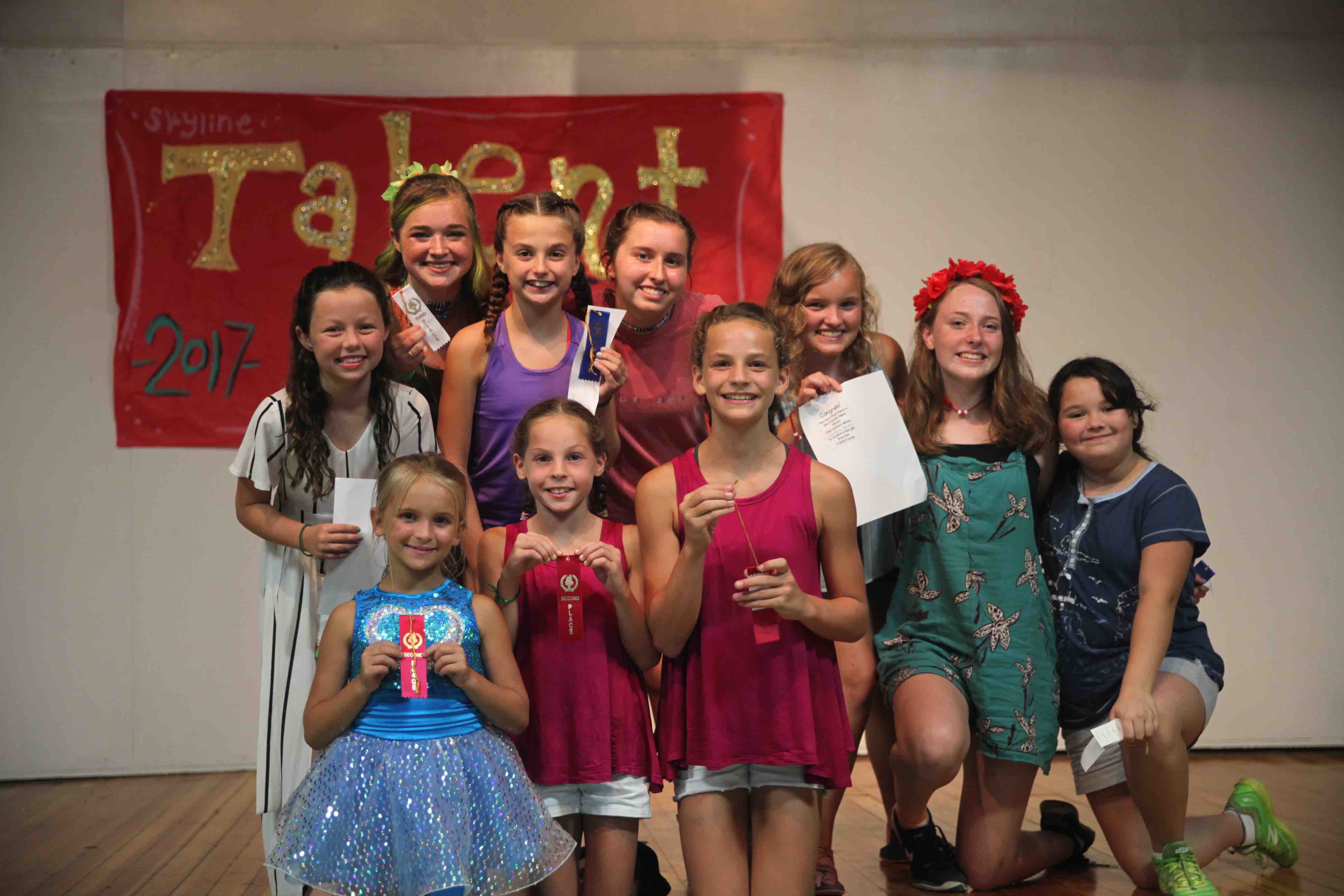 After 2 full days of activities and our busy “Sock Wars” last night, everyone was really looking forward to having a slower paced night and getting to take it easy in the gym to watch our own Skyline Talent show! And what a show it was! Folks, we had all kinds of talent up on that stage and mean all kinds!! There was singing, piano playing, ukulele playing, gymnastics, a harry potter themed painting that had a really cool ending and even someone playing the piano with their toes (ya know I couldn’t make this stuff up if I tried!!) All the campers that performed did a great job and you could hear all the cheers they were getting after each act, all over camp. Not only did we have a record number of acts, we had a record number of GREAT acts that entertained all the other campers all through the night. When it was all said and done our judges were able to pick out some winners and here they are: Groups 1,2,3,4: