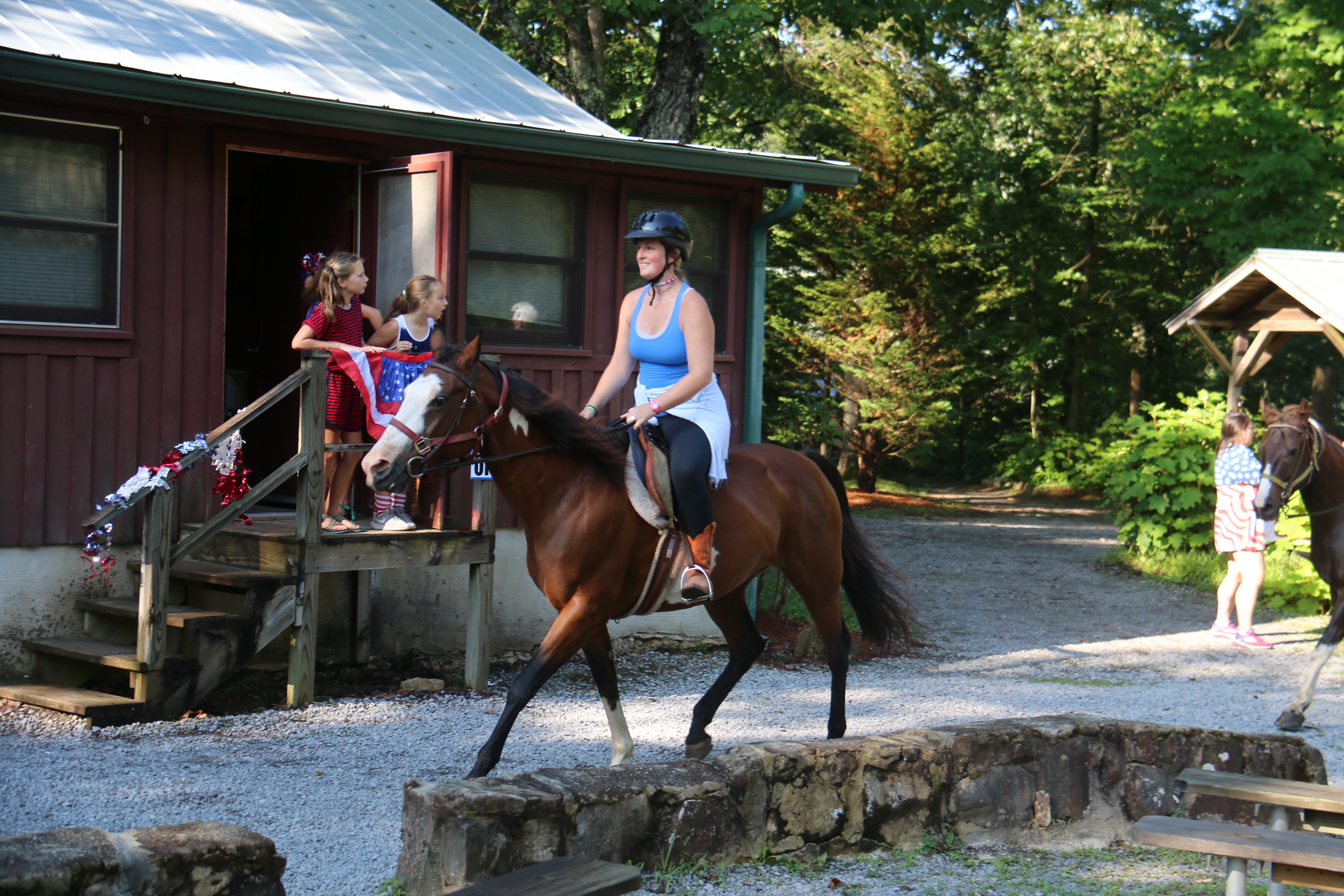Following breakfast and cabin clean up it was time for our parade through camp complete with horses, cabin floats, and club representatives. We even had our camp nurses with their own “float” (golf cart) and a special guess appearance from a T-Rex (it was a friendly one though!!). All the campers cheered and chanted USA! USA! as their cabin mates walked past with their signs and passing out candy to everyone sitting n the side of the parade route.