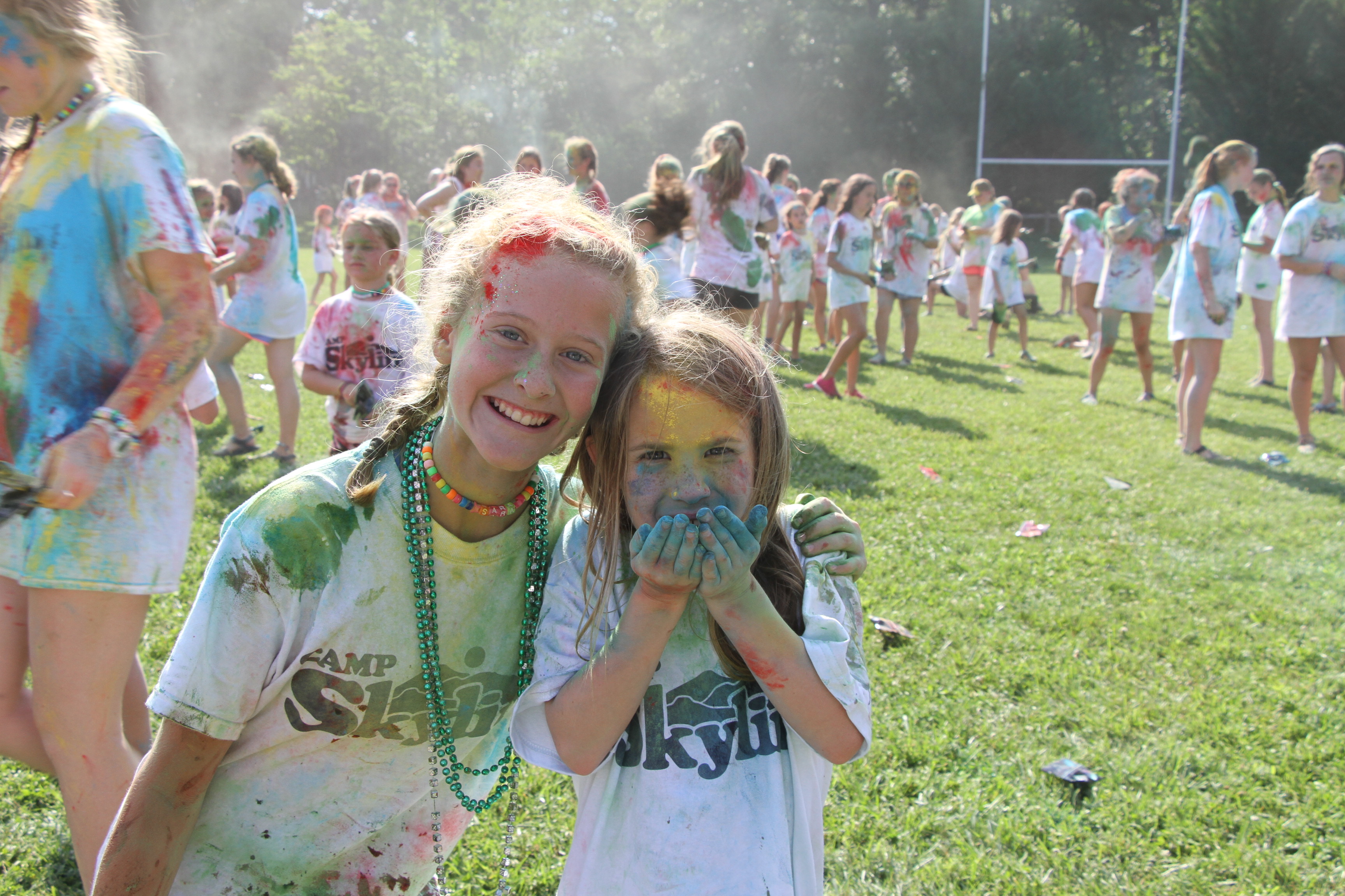 4:00 PM All Camp Color War activity. If anyone was worrying the campers might be running out of energy, stop worrying. Apparently they found the fountain of youth (or they ARE the fountain of youth) as they run all around the spots girls voices and a cloud of paint powder fill the air. What used to be white T shirts are soon becoming tie-dye looking shirts not to mention their faces, arms, hair and anything that might take the impact of a color bomb. It doesn’t take long before everyone is covered in paint and all you can see is the smiles on their faces even though they too are colored in paint. They are making enough noise that some of the camp neighbors come out to watch all the fun and see what is going on. It is a spectacle of color.
