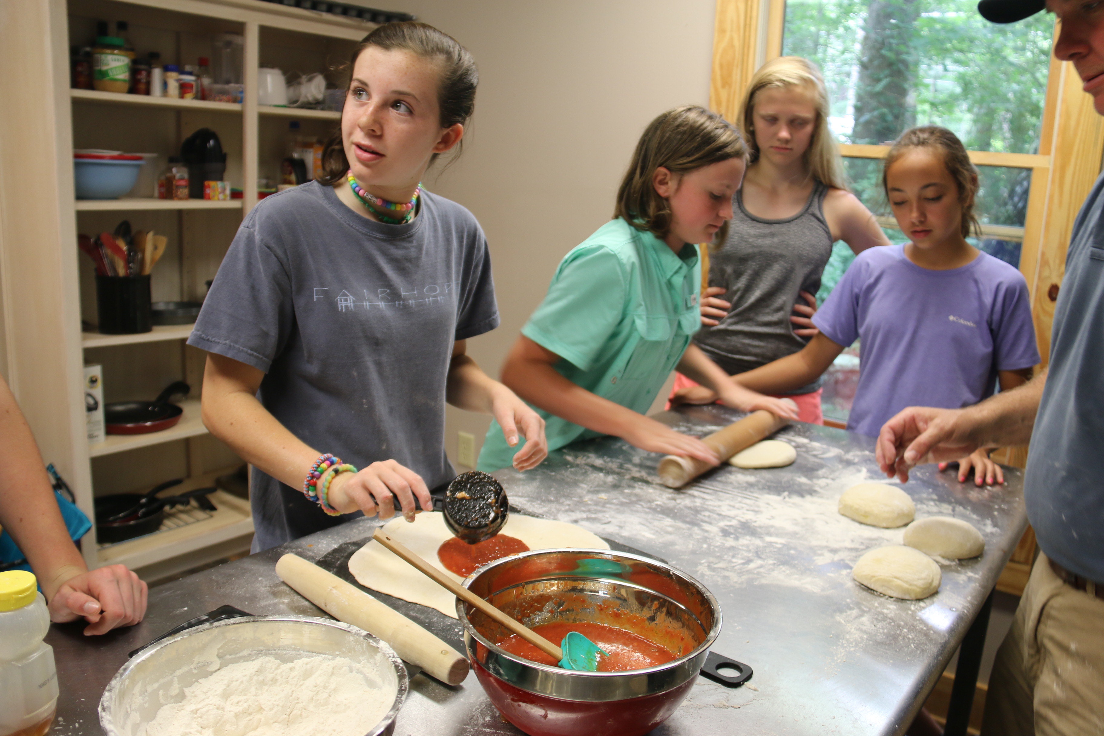 We had a special guest in our cooking classes today as Kevin Dillmon, of Rome, GA, and owner of “Honeymoon Bakery” (also father to one of our current campers and 2 former campers) stopped by and taught our cooking classes this morning. The campers learned how to make a homemade pizza from scratch!! I gotta tell ya folks, they saved me a piece when they were finished and it was REALLY good!! If your daughter took cooking have them make one for you when you get home! You won’t be disappointed, I promise! (this also comes in handy for our older campers when they get to college!!) You could tell how good it was ‘cause I practically had to fight for my one piece, they were gobbling it up as soon as it was finished. Every camper left the class with a big smile and a full belly! A big THANK YOU goes out to Kevin for giving up his time and spending it with our campers to show them some tips in the class!