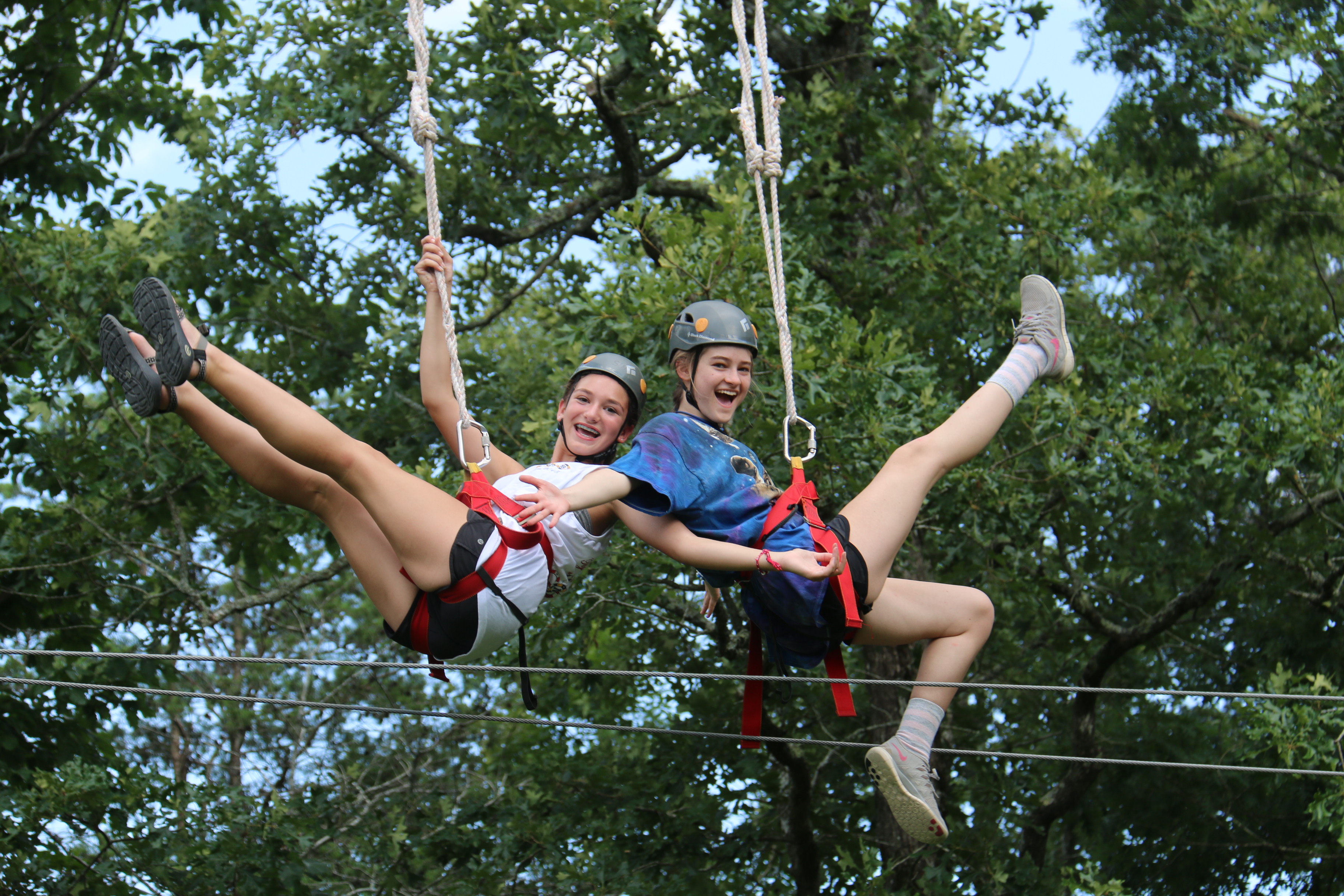 Well, it worked. The captain of the troopers had no answer other than to put on the harness and slowly make her way up the pole to the top. Nothing puts pressure on someone like peer pressure and she couldn’t let down one of her fellow club members. After several painstakingly moments watching her slowly ascend the pole, she made her way to the top, cautiously and carefully positioned herself in a standing position high above the ground and facing the trapeze. It took the whole group of girls waiting at the bottom to count (several times) to three in an attempt to help her build the courage to make the leap to the trapeze but after 4 or 5 times of the group counting to 3 for her, she finally made her jump to grab the bar………She missed the bar, but earned a lot of respect and a hug from her younger club member when she was lowered to the ground. One thing these girls are learning is you measure success in a lot of different ways. And this was a success to more than just the older camper who had no intention of getting on top of that pole today.