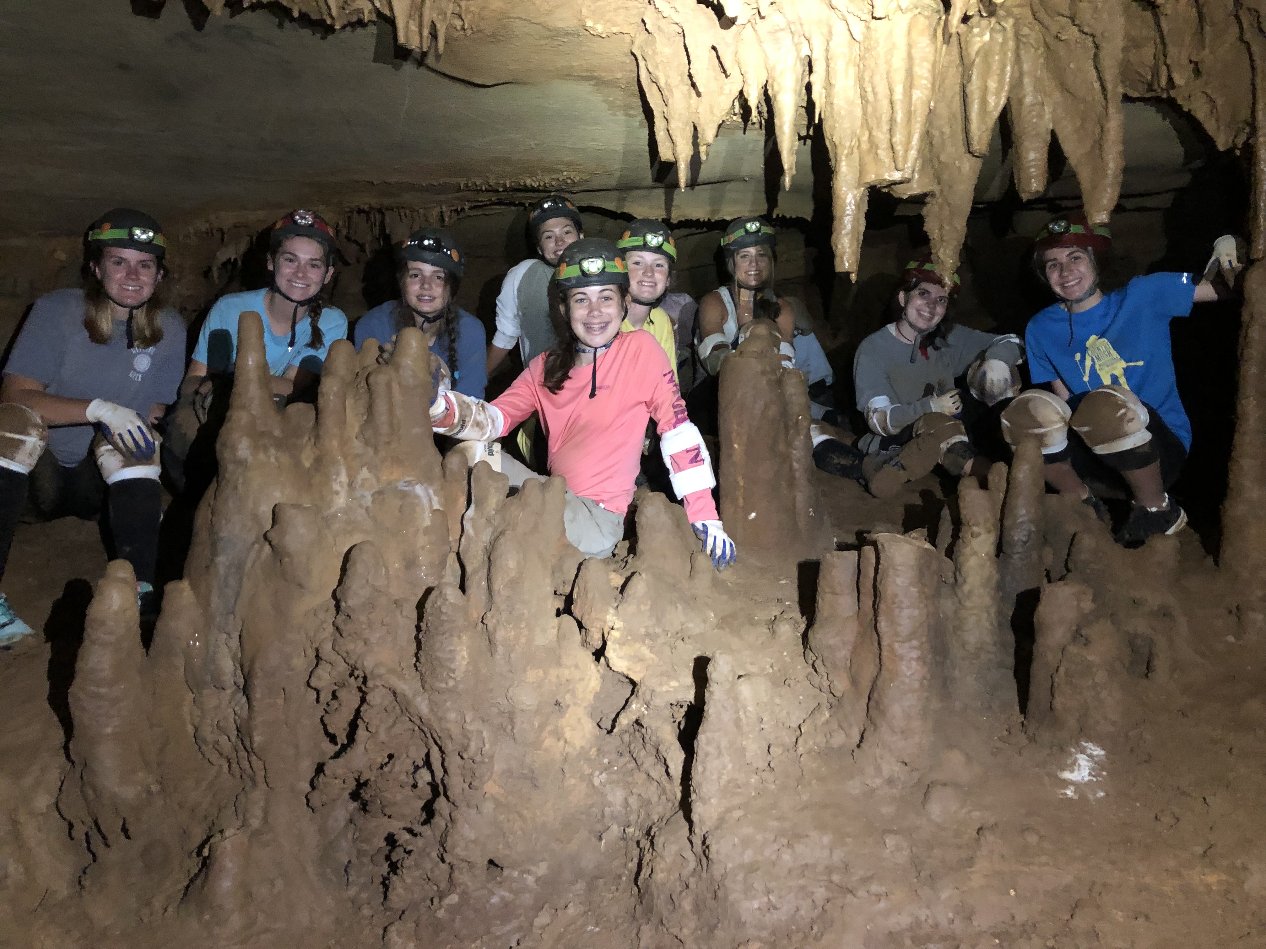 Now soon after that group left camp, our caving and repelling group headed out to spend the day underground in the cool confines of a SCCi cave not far from camp. Now despite what you think about being in a cave, let me tell ya, its 57 degrees, no phone service, complete darkness except for our headlamps and in my and the campers minds, a little bit of Heaven. You really need to look at those pics and take a peek at the before/after group shot out side the cave. When ya do, just look at the difference in their “new” kneepads before and after. Yep, their clothes look the same way, but we did finish our trip up with the gear/clothes cleaning and you can see in that pic, theres an awful lot of mud coming out of those clothes. The girls were amazed at how different the cave looked than what they imagined it would be like. They walked, crawled, and slid through openings that you wouldn’t believe they could fit through and they loved every moment of it. One of the highlights was when we decided to take our own “rest hour” (we really only took 15 minutes) in the cave and it didn’t take long before everyone was fast asleep in the cool darkness. One camper even said “camp rest hour in cool and complete darkness, this was the best rest I’ve ever gotten!” Be sure to check out that folder of pictures and see all the fun they had. If your camper was in the group, don’t be surprised if they ask you about joining a local Grotto and start caving when they get home, they really loved it that much!