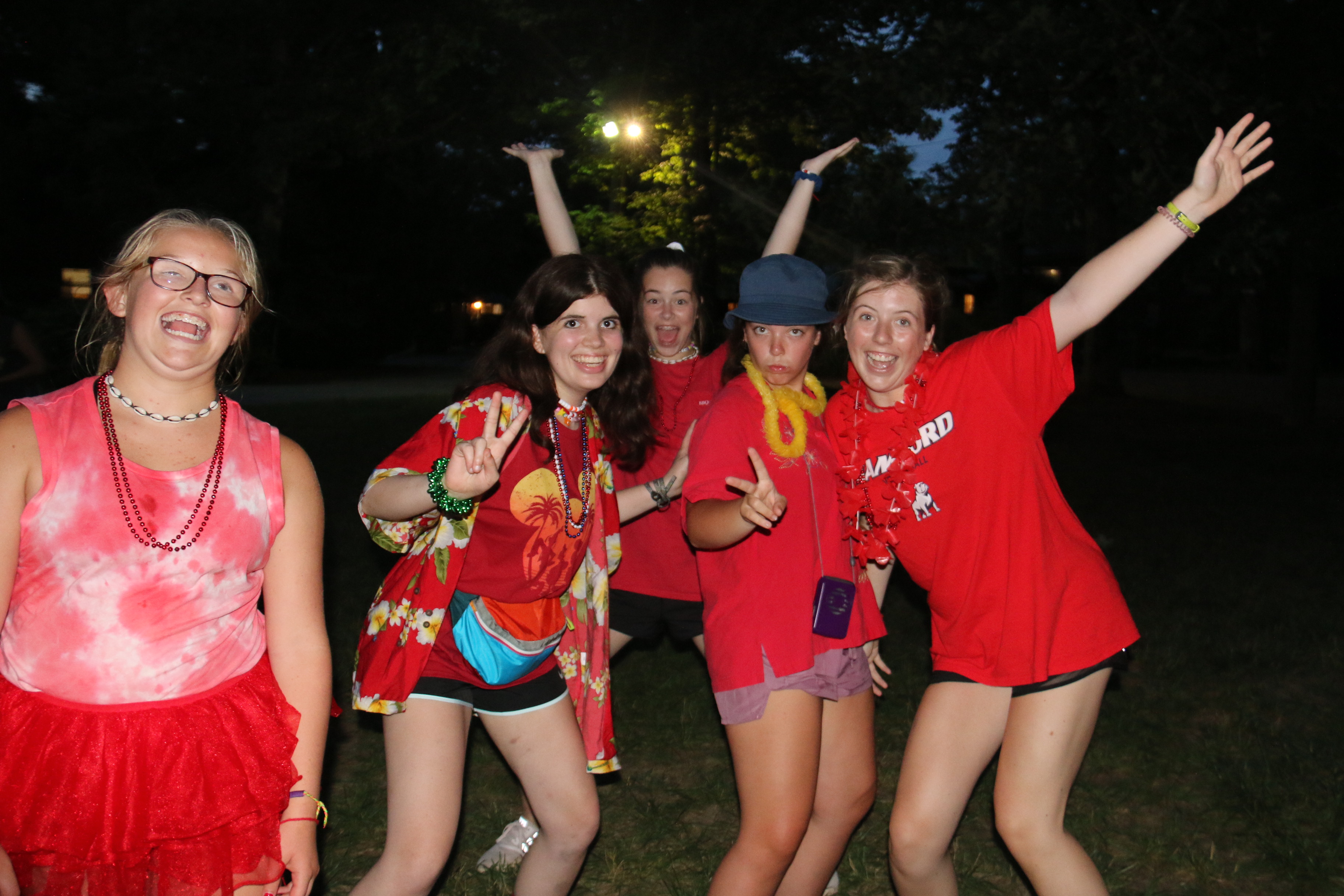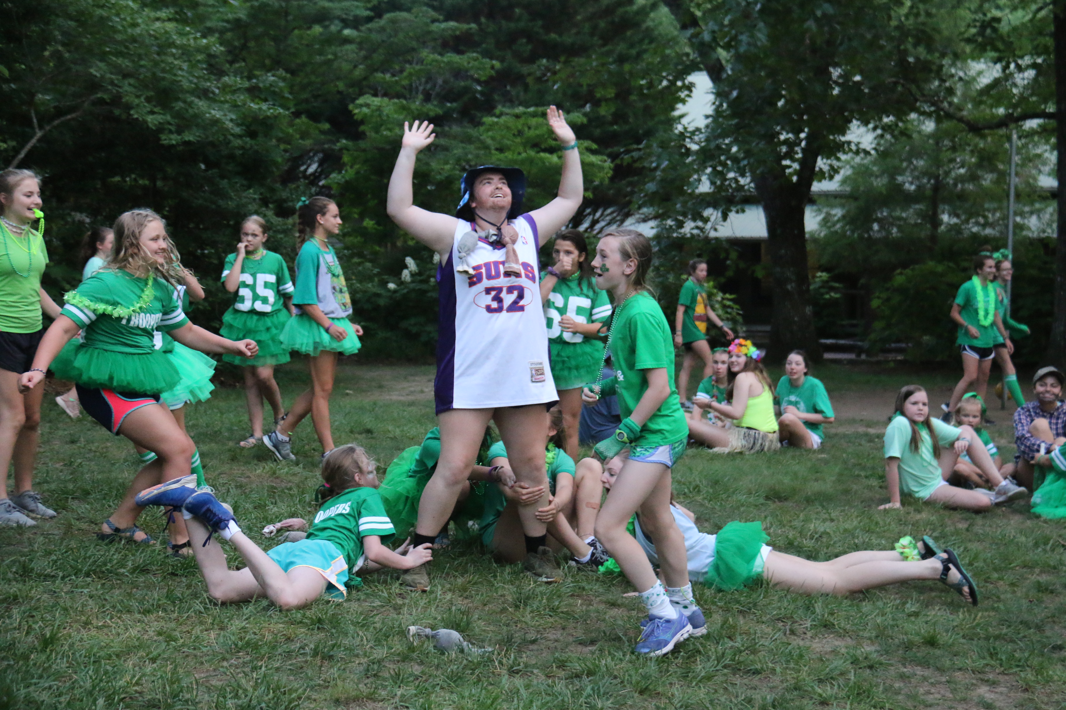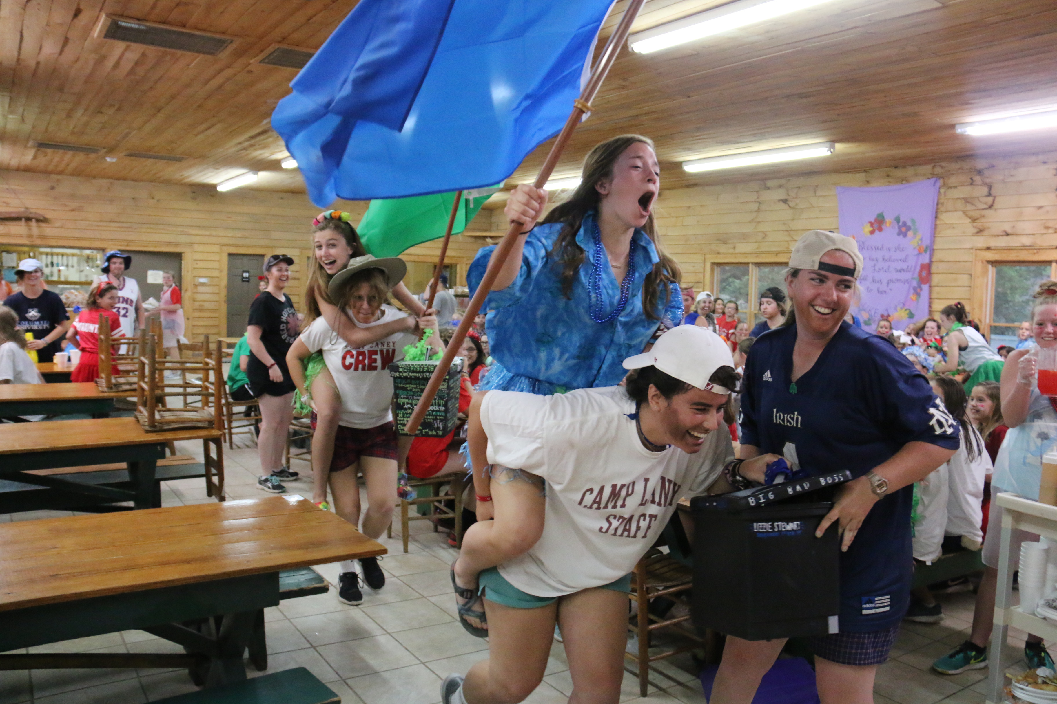 Now after all the fun today it was time for a nice quiet dinner (not really, those girls are LOUD and they sing after EVERY MEAL!! Just wait till they get home and stat singing after every meal at home!!!). When all of a sudden the doors to the dining hall burst open and in comes the counselors from Camp Laney (not really, it was just our counselors dressed up as Laney counselors) and they stormed in and took the club leaders and club flags with right out the door! Now your camper ain’t gonna stand for something like that to happen, and just as soon as they finished their deserts (you can’t go rescue someone on an empty stomach, everyone knows that!) they headed out to started to hunt down those pesky counselors that took their leaders and flags!