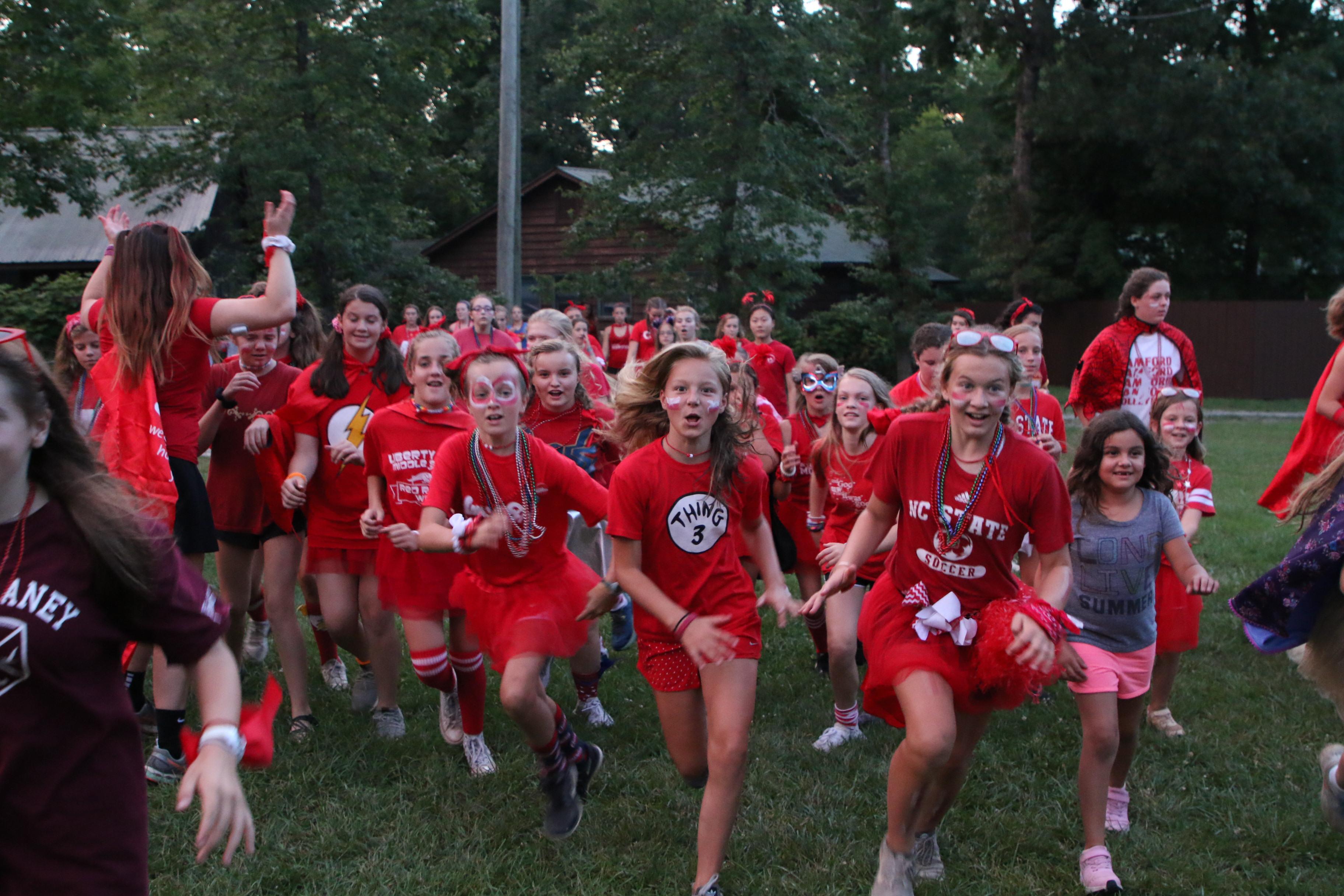 So tonight was actually called “Get Skyline Back” and the campers LOVE it!. It starts off with a nice quiet dinner (not really, the girls sing/shout after every meal) when all of a sudden the Camp Laney counselors (not really, its just our counselors dressed up as the Laney counselors) come busting into the dining hall and take the club leaders, their club flag and their club boxes and kidnap them out into camp. Well, you and I both know your campers just aren’t gonna stand for that and they headed right out (not really, they had to finish their dessert first, you can’t have a rescue mission on an empty stomach).