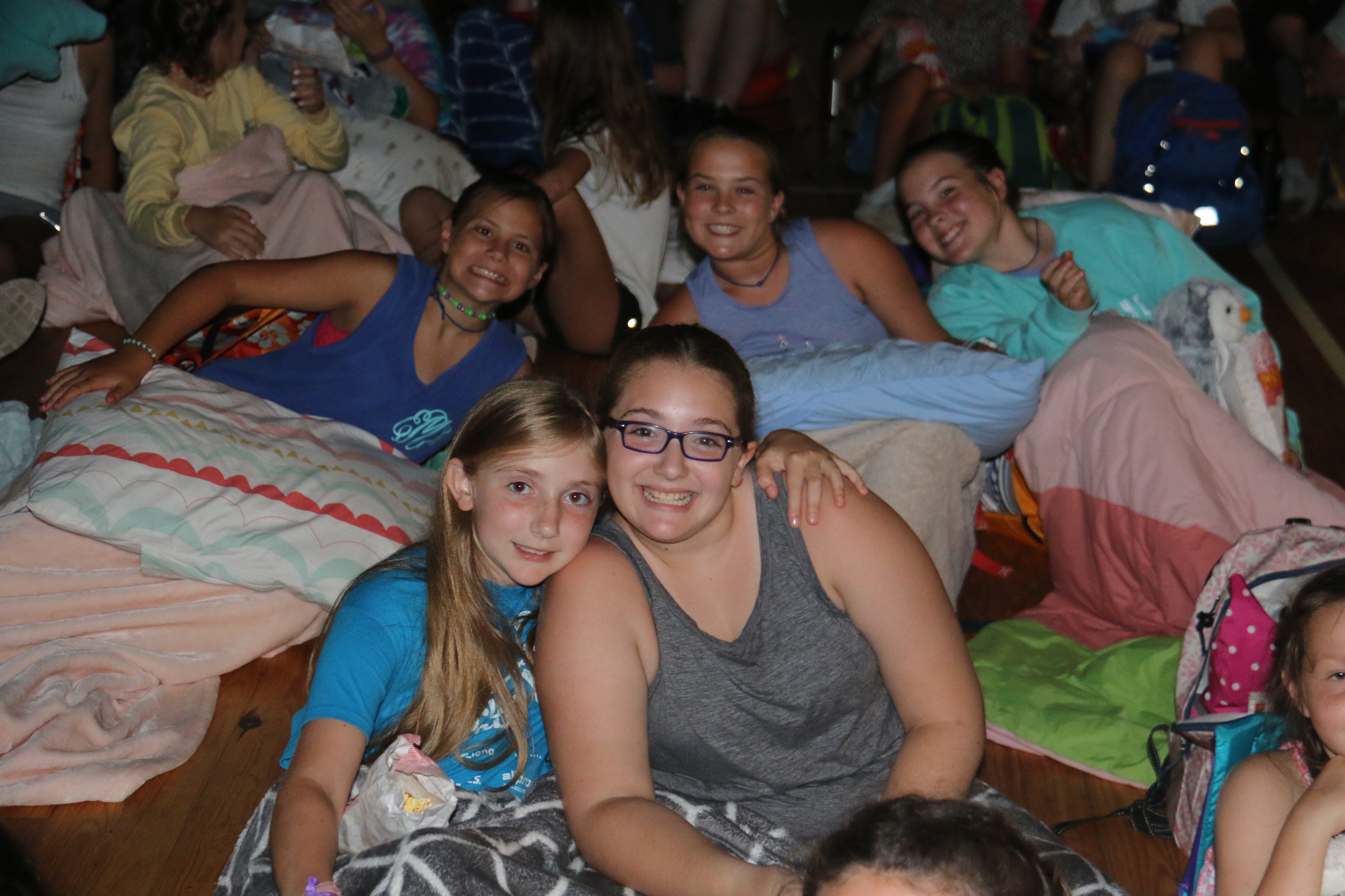 Tonight everyone came to the dining hall in their PJ’s ready to eat and then enjoy the movie. As soon as everyone finished, they headed up to the gym, grabbed their personal bag of popcorn (no one really likes to share popcorn at a movie) and set up their pillows and sleeping bags to enjoy the movie in the cool night air. Or at least that’s the plan… As I was up there getting the pics before the movie started, most of them had already settled in and gotten comfortable and to tell ya the truth, I’d be surprised if they made it through the opening credits. For those that were able to stay awake, they were treated to “The Parent Trap”. A perfect choice for campers to see. (for those few that stayed awake)