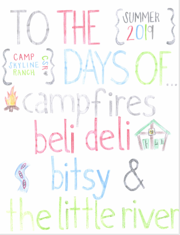 I loved hearing what Megan had to say about her inspiration for her submission! “When I first was thinking about my design for the memory book, I wanted to create something that captured the most memorable things in my time at Camp Skyline. To me, going to camp has always been about having two weeks to get away from the busy life at home and spending that time with some of my favorite people. Camp life is simple, so I created a meaningful, simple picture that incorporated my favorite parts about camp and served as a constant reminder of home on the mountain!!”