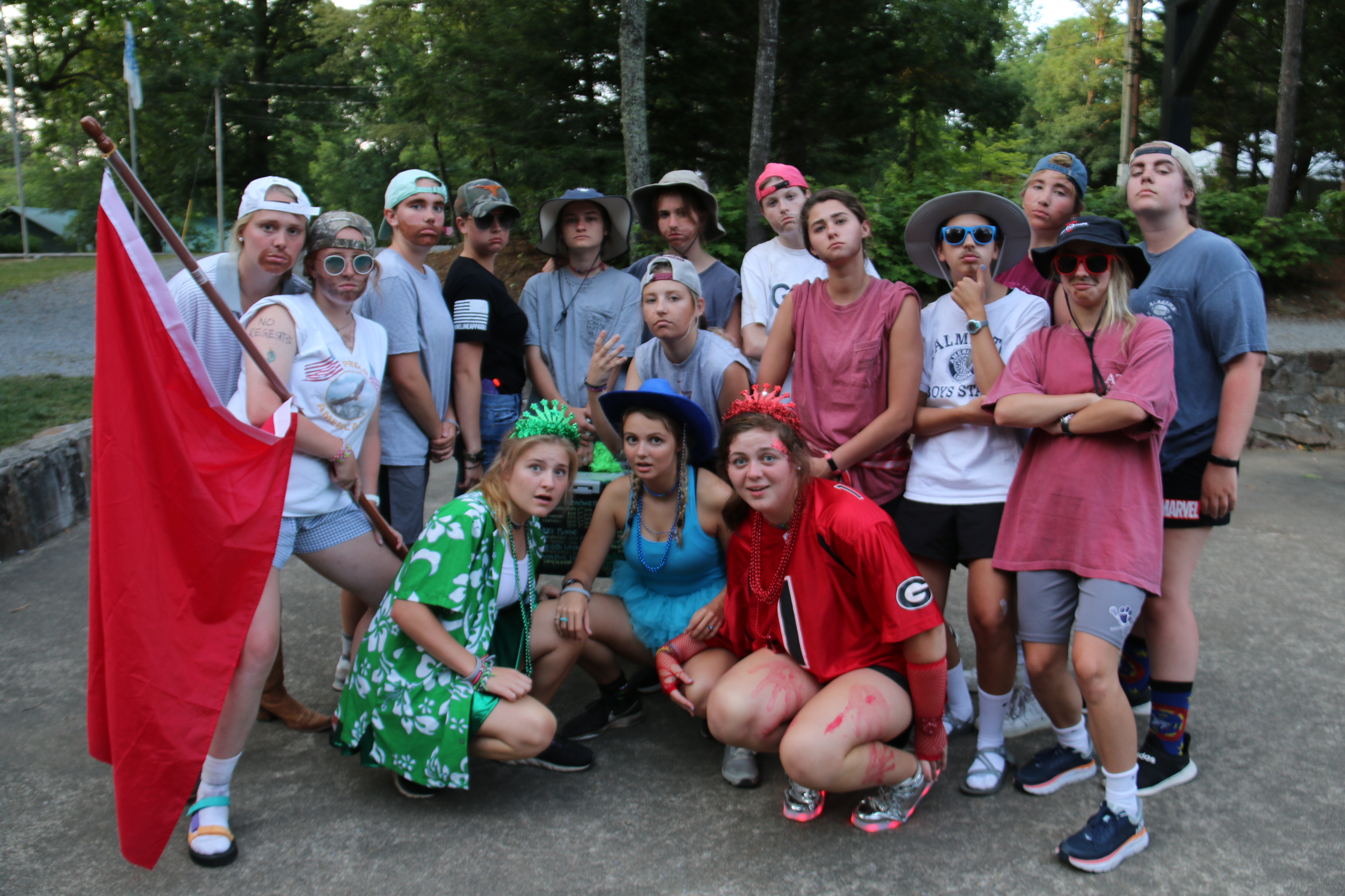 I can’t believe in all my gibberish last night I forgot to tell ya about tonights activity (told ya its gettin’ easy to forget things now!), Get Skyline Back. This is one of the camper all time favorite nights as it all starts out while they’re enjoying a nice quiet dinner in the dinning hall (ok…maybe that part isn’t entirely true…. with this many girls eating in the same building theres nothing quiet about it!). They were, however enjoying dinner when all of a sudden those stinky ol’ boys from Camp Laney burst in and kidknapped the club leaders, their flags and the club boxes!! (Don’t get all worried on me now, it was really our counselors dressed up as the Laney boys… we wouldn’t ever let that happen). No where was I…. oh yea, those ‘boys’ took the club leaders outside and took them to separate places in camp and held them there until the rest of the campers could come to their rescue. Now you know your campers just weren’t gonna stand for something like that and as soon as they finished their desserts (you can’t form a rescue on an empty stomach) they headed out to get their leaders, flag, and cabin boxes back to where they belong.