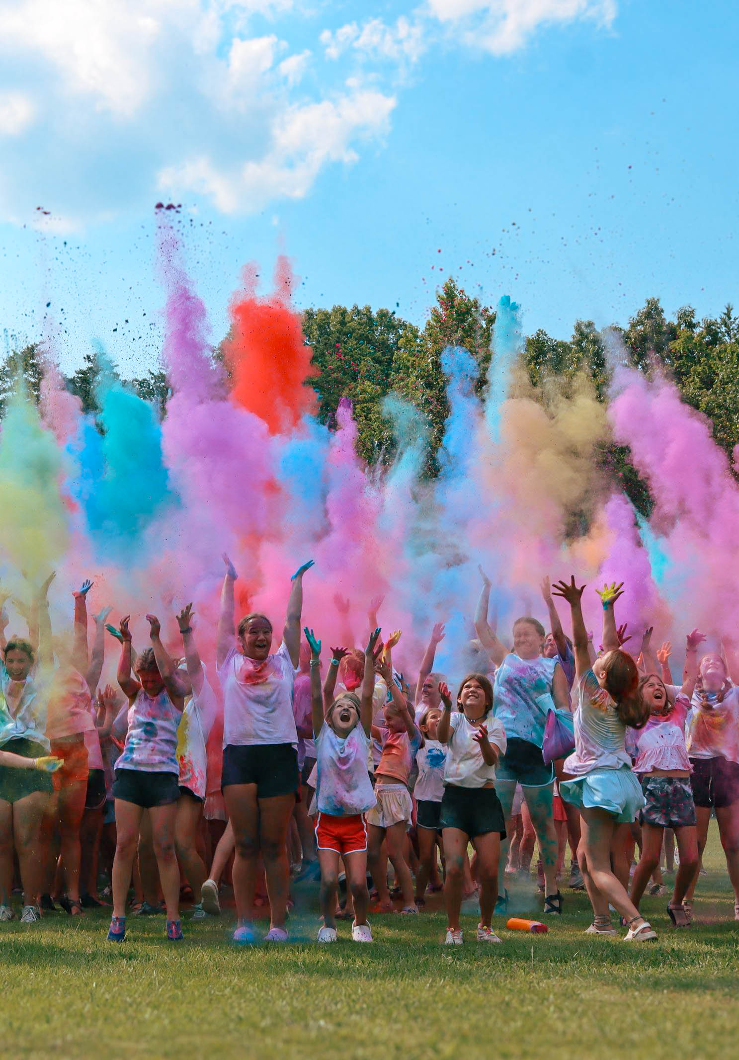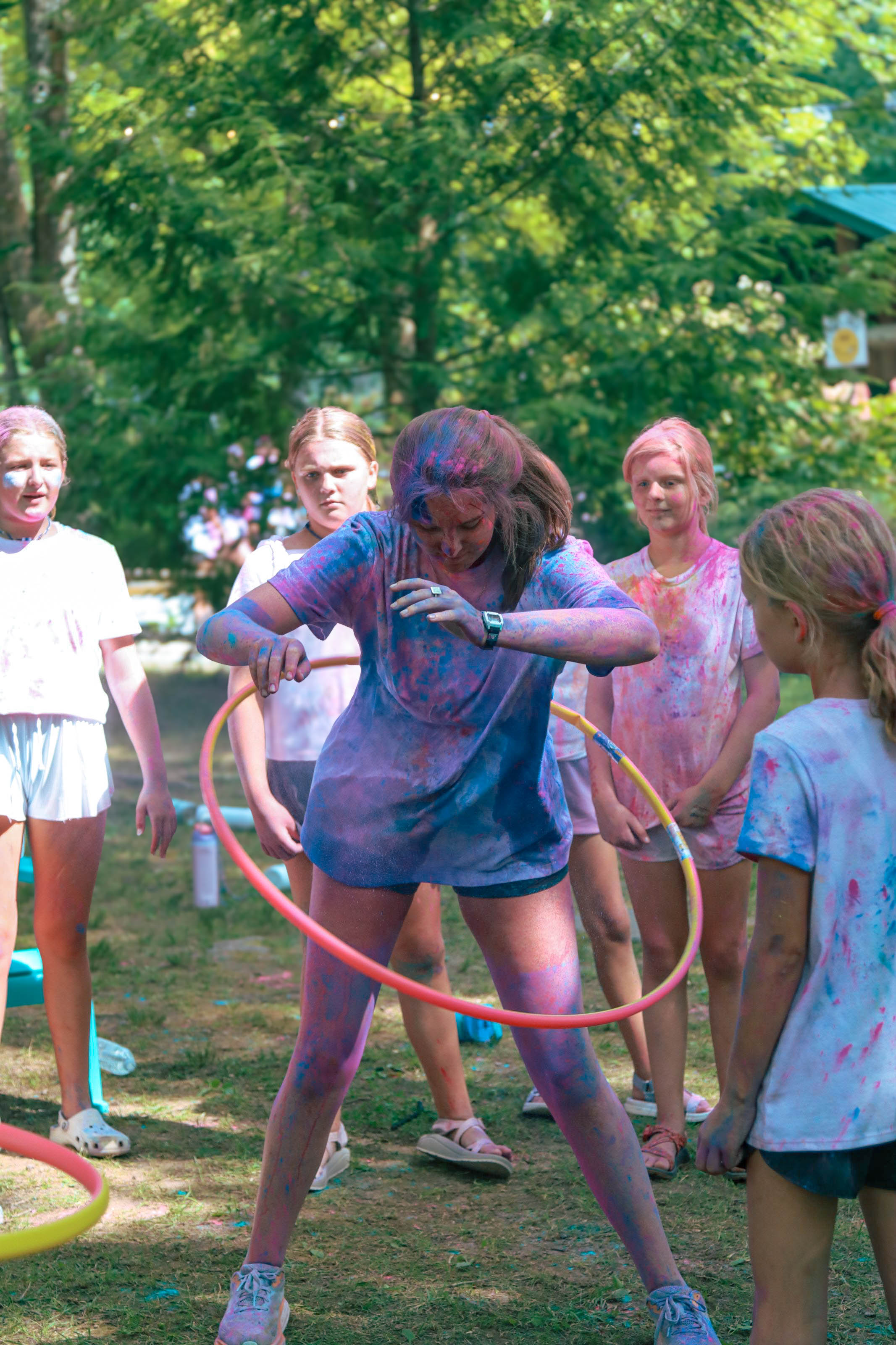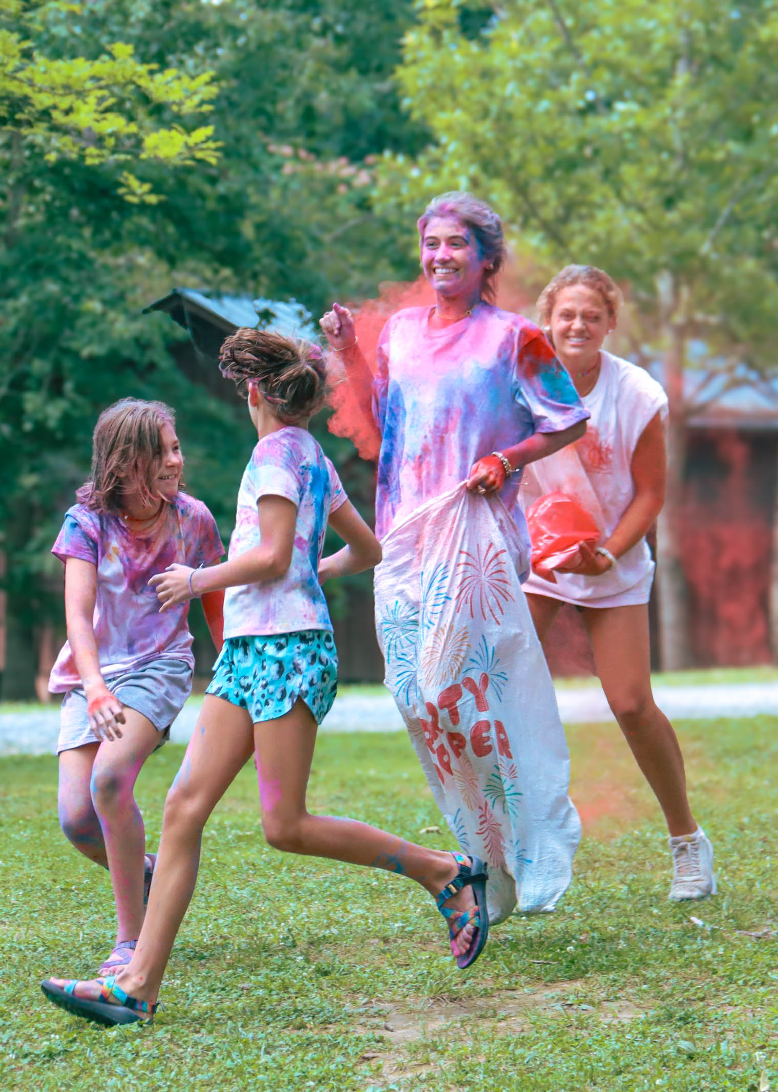 The girls competed in fifteen challenge stations in Color Wars, racing to keep their counselor the cleanest. After finishing, they gathered at Riverside Field, each received a handful of colored powder, and joyfully tossed it into the air and at one another. When the colorful chaos ended, everyone headed to the river to rinse off! RIverside rooms 20, 21,22, and 24 won and their counselor was Julia!