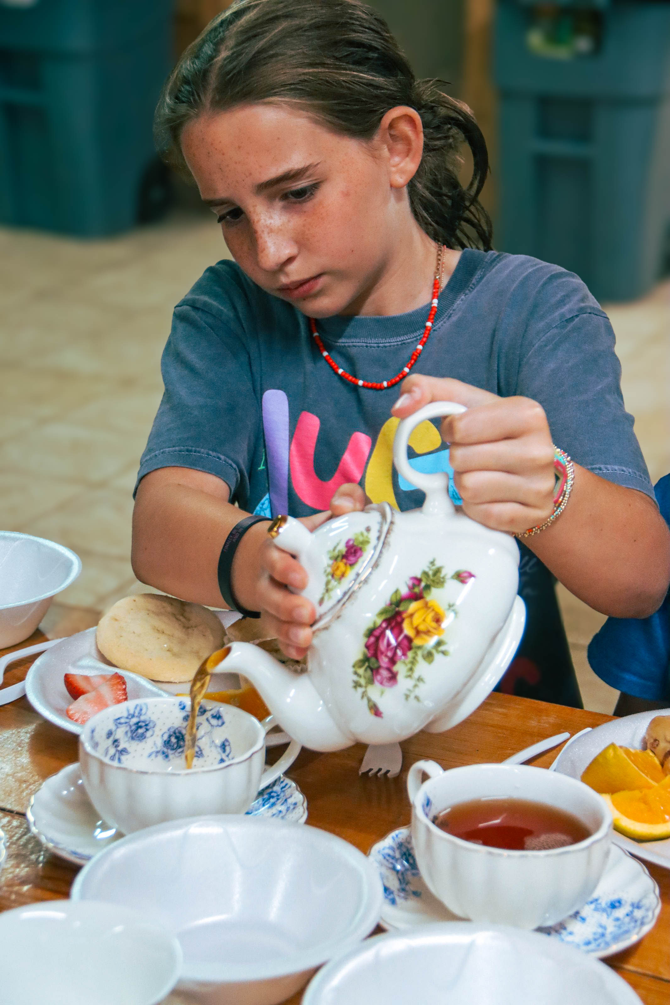 This afternoon in Home Science, the girls had a fun tea party. They put to good use the table etiquette they learned the day before. The girls had a nice assortment of scones, blueberry muffins, sugar cookies, fresh oranges, and strawberries. On the Hut Row and Lodge side of the river, Driftwood took home the win for cabin clean-up. Over on the other side of the river, Riverside Room Four was the big winner!