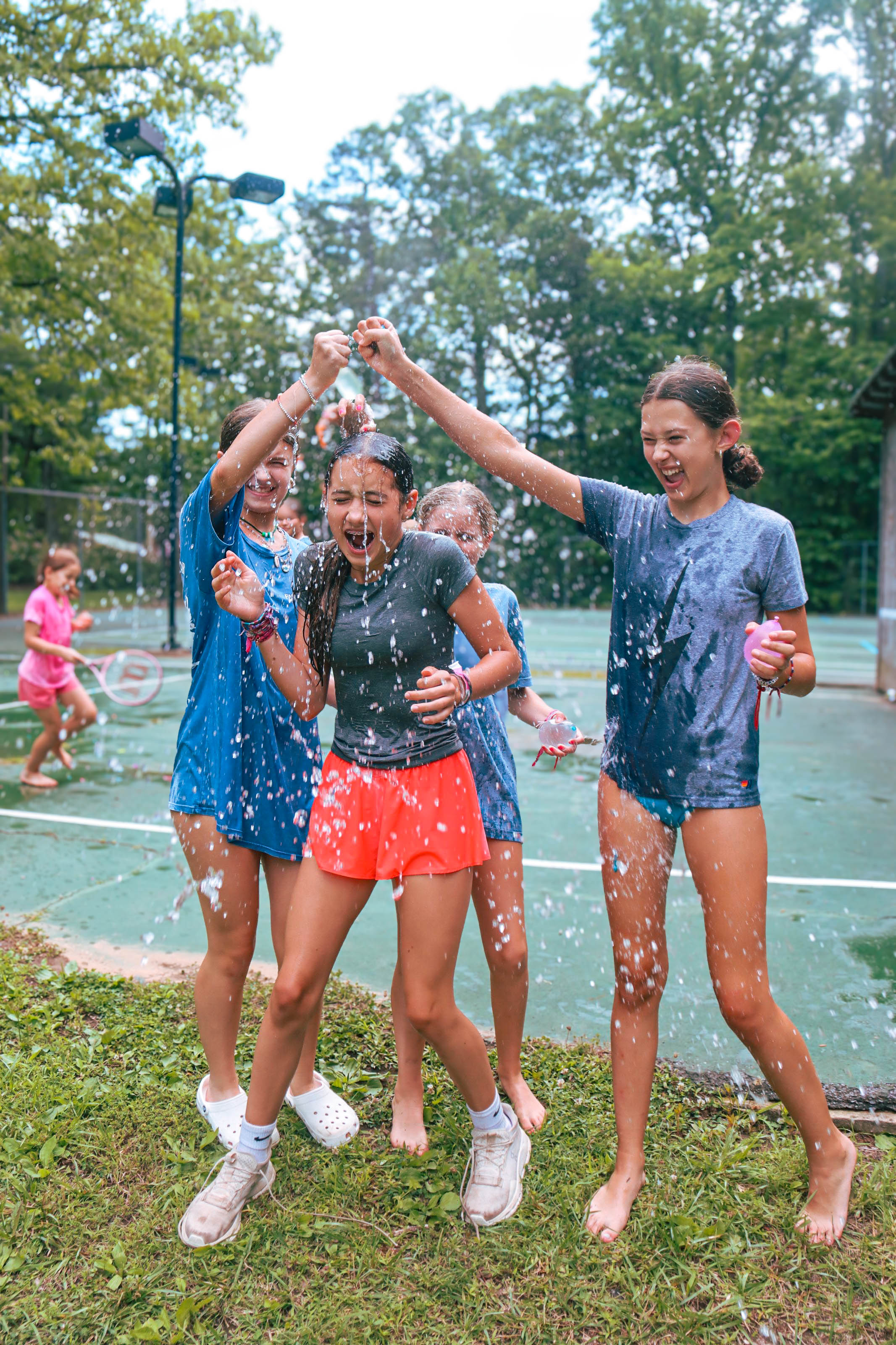 While climbing the tower, the girls faced a small obstacle that tested their skills. From the top, water balloons were tossed down, both cooling them off and adding an extra fun challenge to their climb.