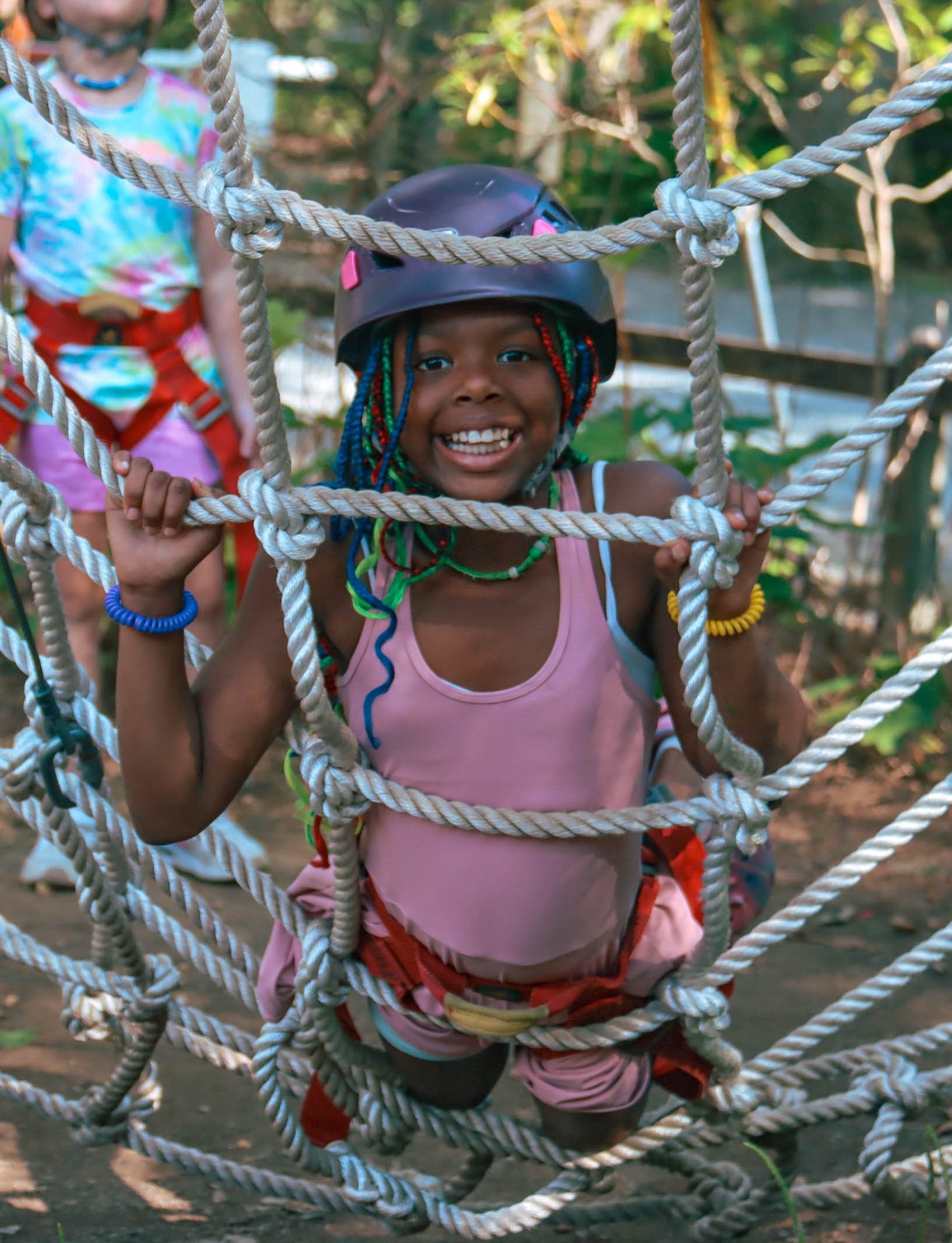 The girls tackled the V‑Swing circuit and explored the “woods,” displaying teamwork and determination as they climbed the dangling duo. They also conquered the Pamper Pole, climbing high and jumping to grab the trapeze. To reach the V‑Swing, they navigated a beam bridge and logs, then took the thrilling swing ride!