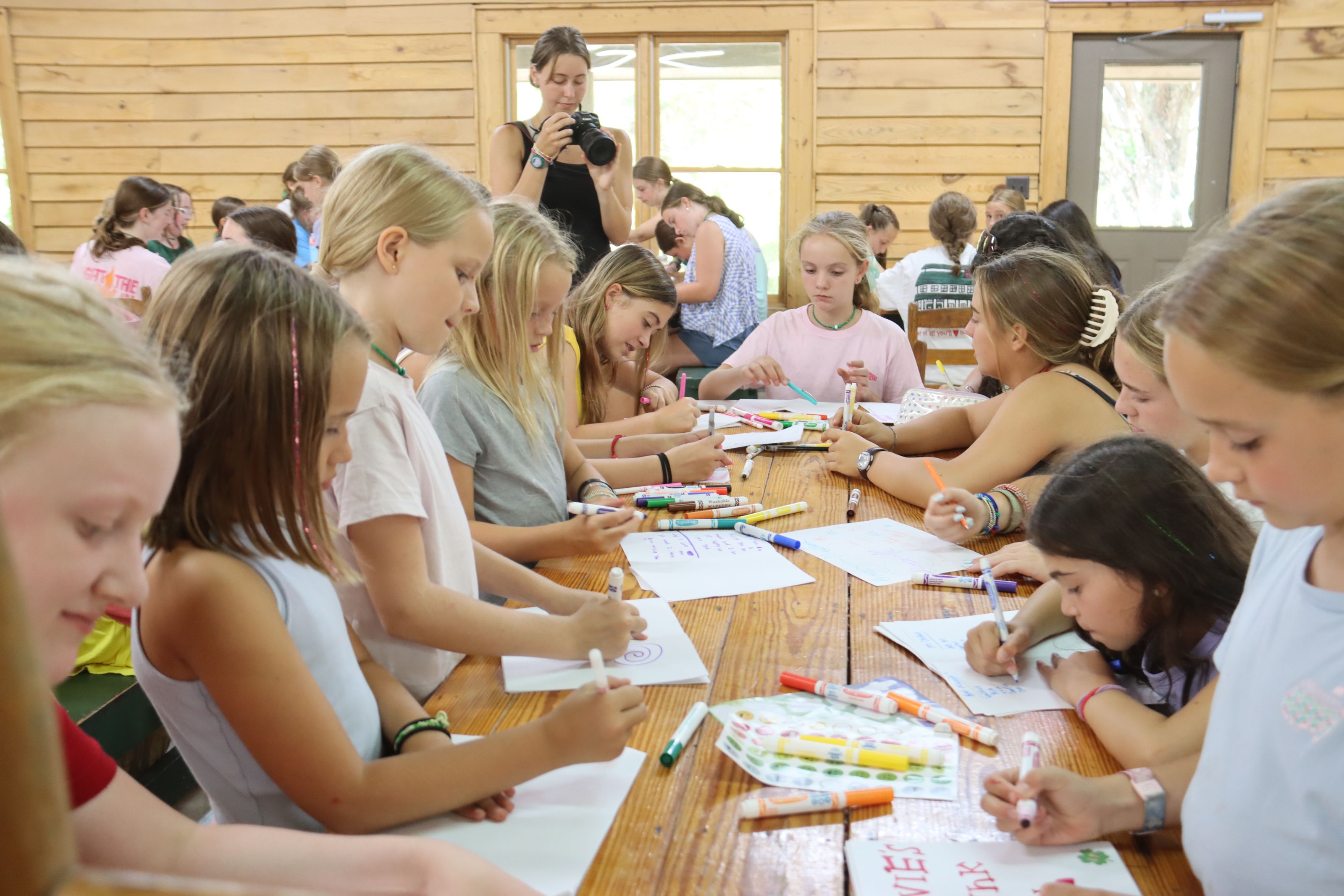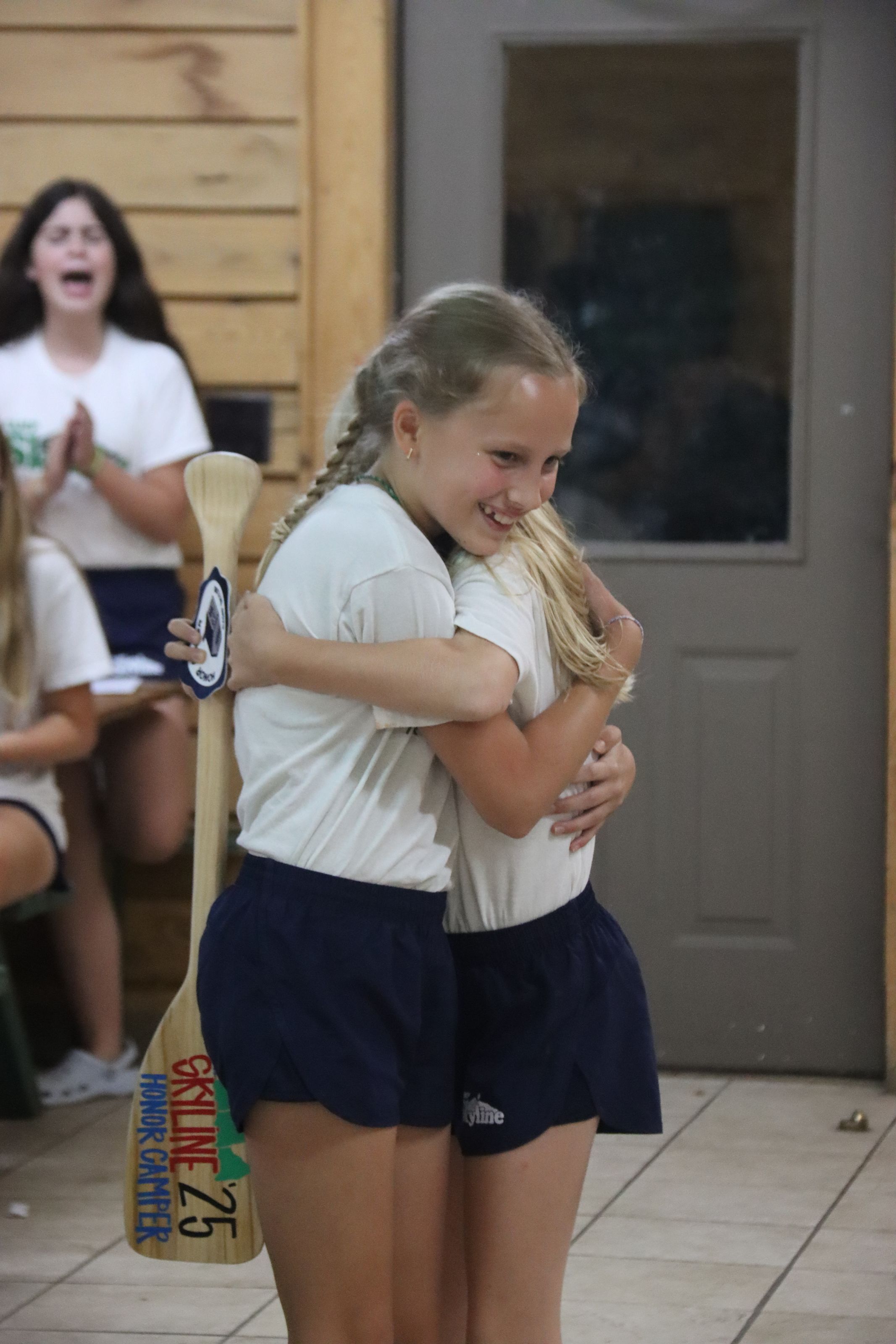 To start banquet off everyone went to the gym! At the gym everyone got their patches and learned if they got stitched to see if they might get lettered in their activity! We put a little break on patches and went to the dining hall for dinner. Every banquet we have chicken tenders, greenbeans, mashed potatoes, and rolls. For dessert we get a extra special treat, drumsticks! We all watched a slideshow with pictures and videos from all session long! After a short break everyone comes back to the dining hall and each counselor gets toasted! Even the admin got toasted this session by the headcounselors. Instead of a speech the heads gave a poem slash distrack and gave them all a special gift! Not only did the admin get toasted Larry got a special heartwarming toast from the girls in CSR! Each age group had a chance to win honor camper and we even had a pair of sisters win, so be sure to ask your camper tomorrow morning who won. Now onto the cups! We always do a big drumroll before saying who won, so if your at home reading this with your family or by yourself give a big drumroll because the troopers won the horseshow and point cup and the rangers won the spirit cup! It was then time for hugs and a few goodbyes for heading off to the river for vespers. At vespers each club sang their slow song, each cabin gave their cabin wish, and the age outs gave their speeches! To wrap it all up Sally gave the final campfire and everyone headed off to their cabins!