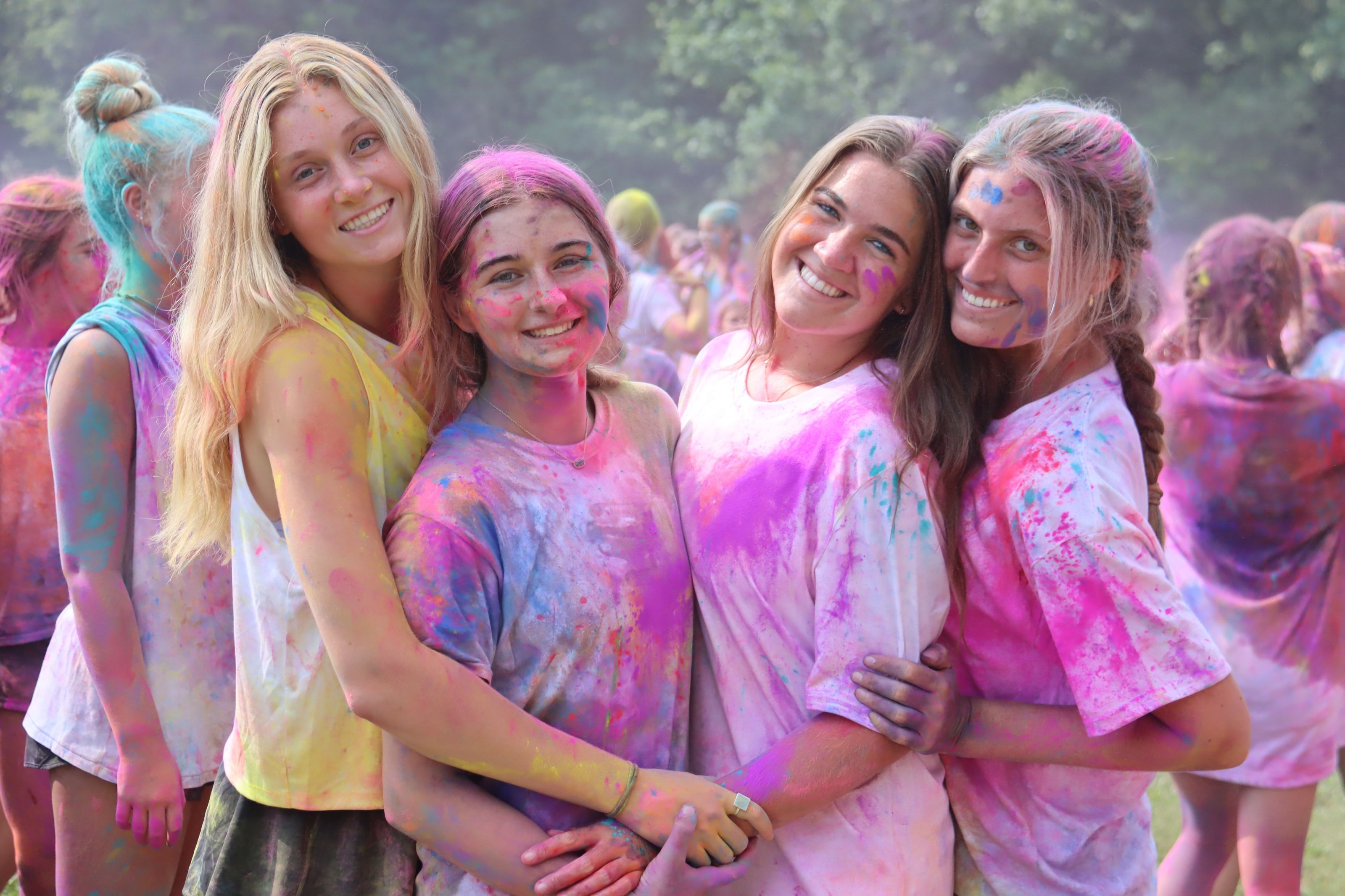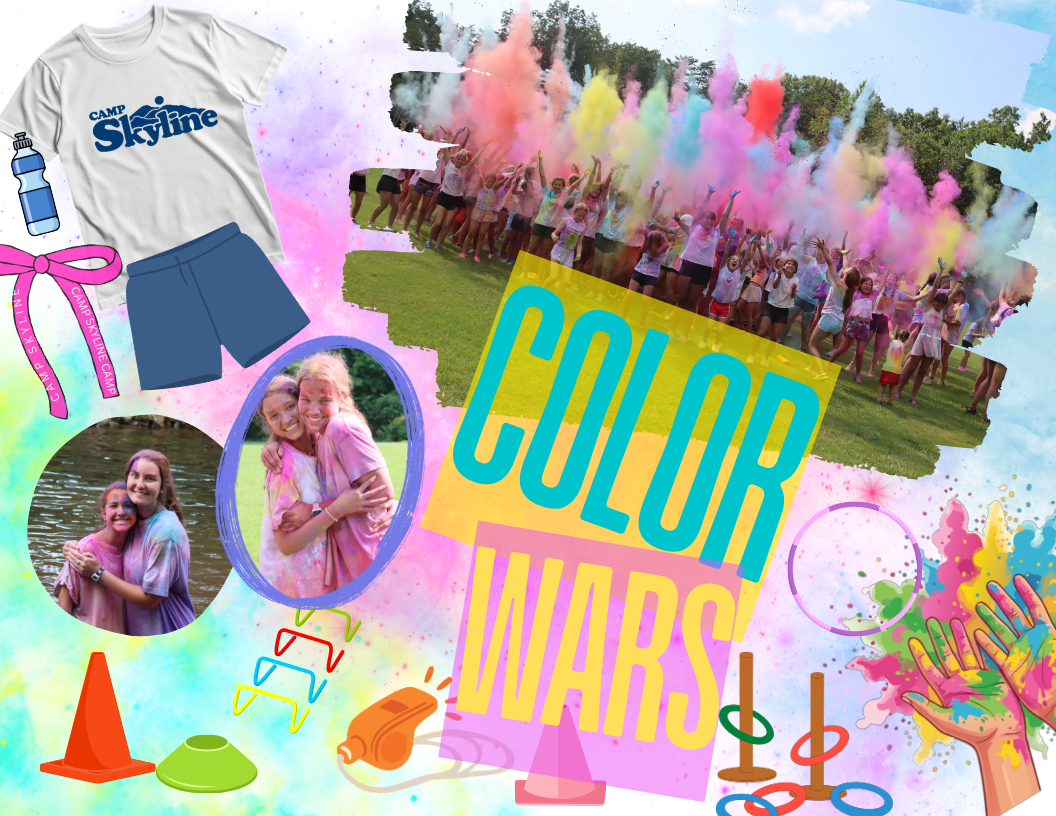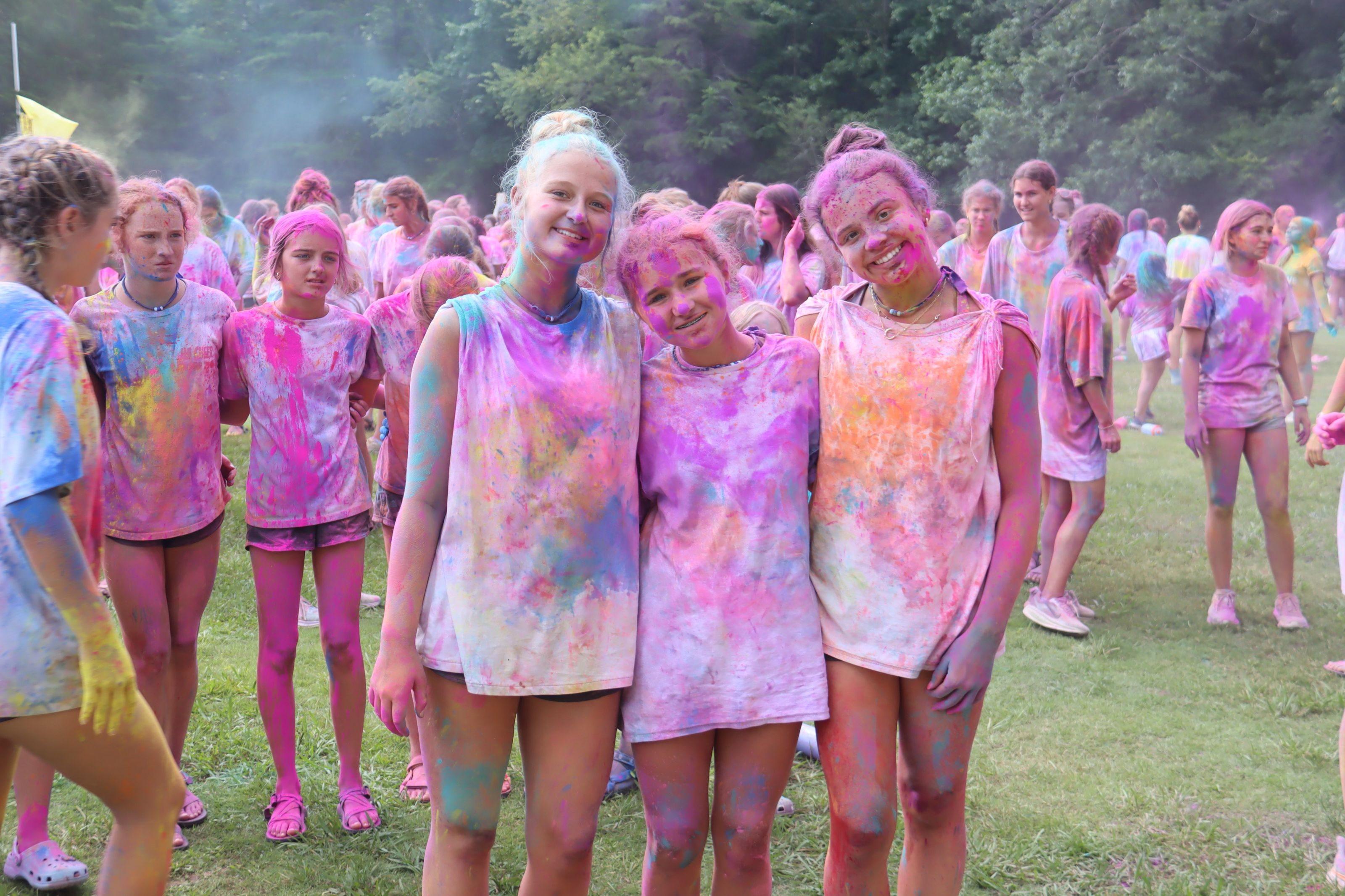 2ND SESSION: Things get bright and competitive during Color Wars! Held on the second Tuesday of second session, campers suit up in white Camp Skyline t-shirts and dive into a full day of challenges, games, and team spirit. The mission? Protect your counselor from getting covered in colored powder! The counselor with the least color at the end claims victory. The rules loosen up after the competition. Campers get their chance to toss color, celebrate with friends, and snap vibrant photos on the riverside field. And for the grand finale: a refreshing jump into the river to wash it all away!