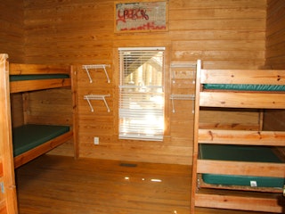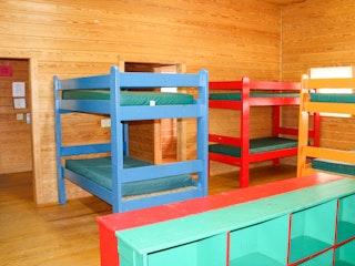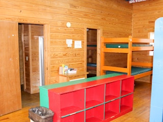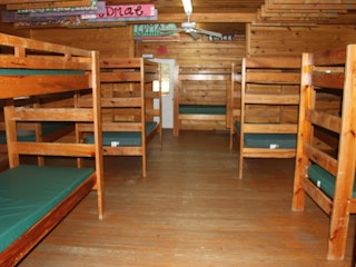 One large building that contains 5 cabins. Each cabin holds up to 18 people and there are 2 bathrooms and showers inside each one. The Lodge can accommodate 90 people. The lodge also has its own kitchen facility.